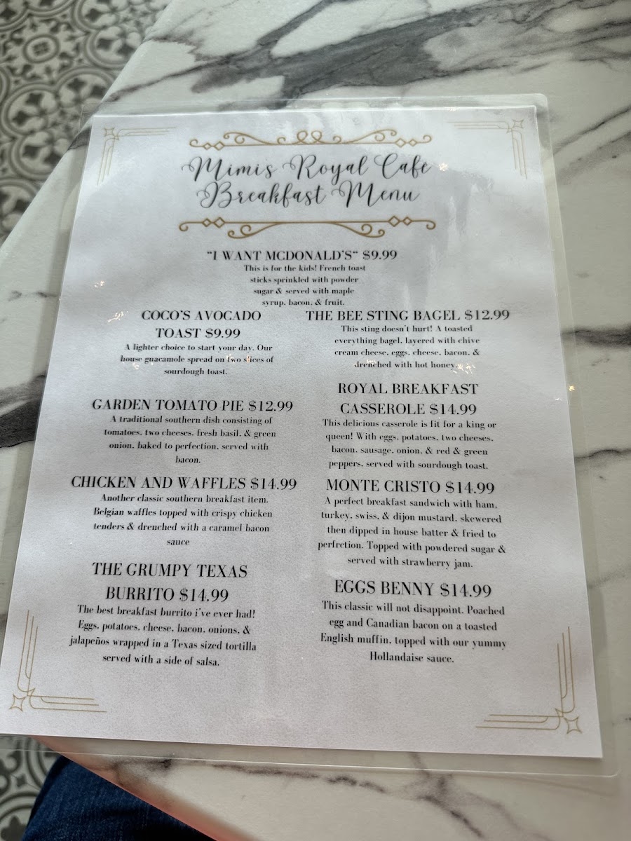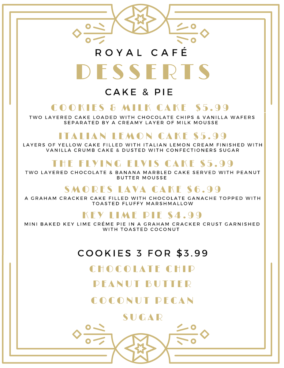 As a satisfying end to your visit, the menu at Mimi’S Market And Royal Café offers a diverse array of choices that blend comfort and creativity. The starters set the tone with Hummus & Pita Bread, Sausage & Cheese Tray, and Vegetable Crudités, while the greens section tempts with classics like Caesar Salad, The Holy Trinity, Bobo's Hot Lettuce Salad, and a hearty Fried Chicken Salad. Sweet lovers will appreciate desserts such as Cake & Pie, Cookies & Milk Cake, Italian Lemon Cake, The Flying Elvis Cake, and Smores Lava Cake. Breakfast favorites include Coco's Avocado Toast, Garden Tomato Pie, Chicken And Waffles, The Grumpy Texas Burrito, and The Bee Sting Bagel. Sandwich selections span cold options like Dad's Favorite, Golden Delight, The Royal Club, Buffalo Ranch, and Turkey Dill, alongside hot choices such as Crazy Cuban, Jersey Shore, Wagyu Burger, Rueben's Rueben, and Carolina Chicken. Throughout, the menu’s variety and thoughtful preparation shine, making it easy to find something to suit every taste.